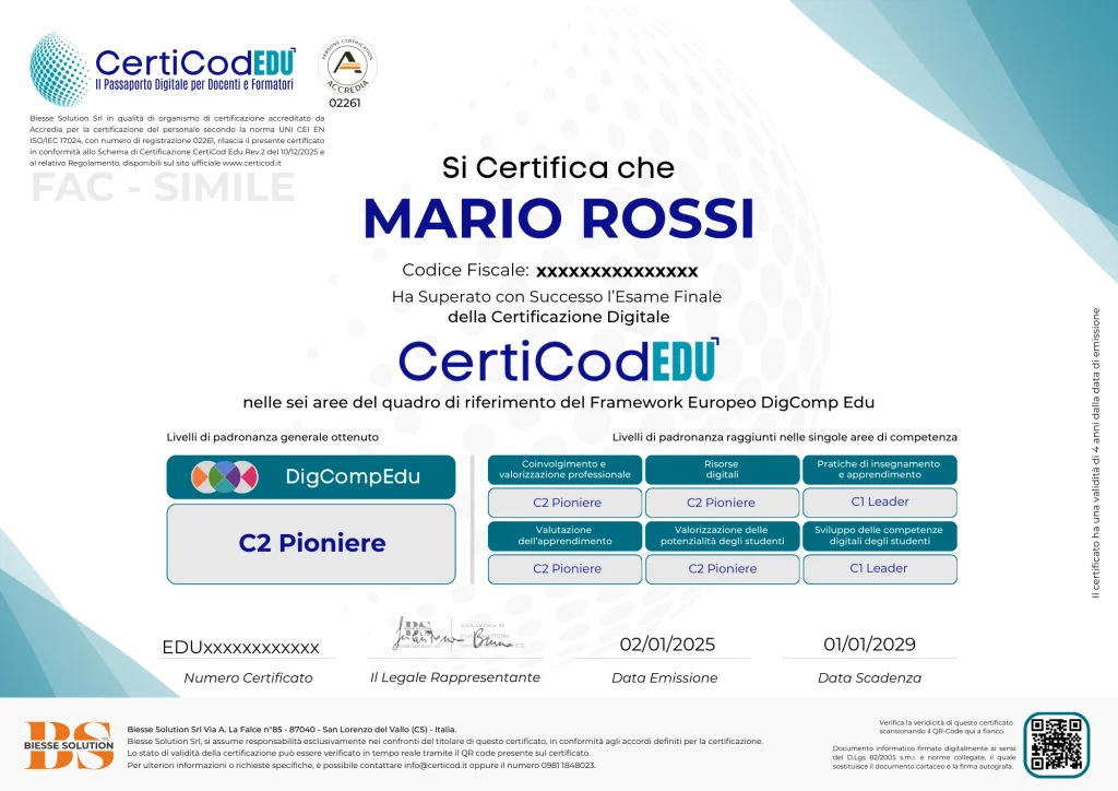 L’accreditamento, identificato con il numero 02261, copre le figure professionali del “Digital Competence Framework for Citizens – DigComp 2.2” (schema CertiCod Full) e del “Digital Competence Framework for Educators – DigCompEdu” (schema CertiCod EDU).